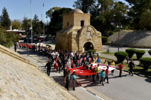Ardından Bakan Çavuşoğlu, öğrenci ve öğretmenlerle kortej halinde Cumhurbaşkanlığı’na yürüdü. Korteje, Lefkoşa Türk Belediyesi Gezi Treni de eşlik etti.