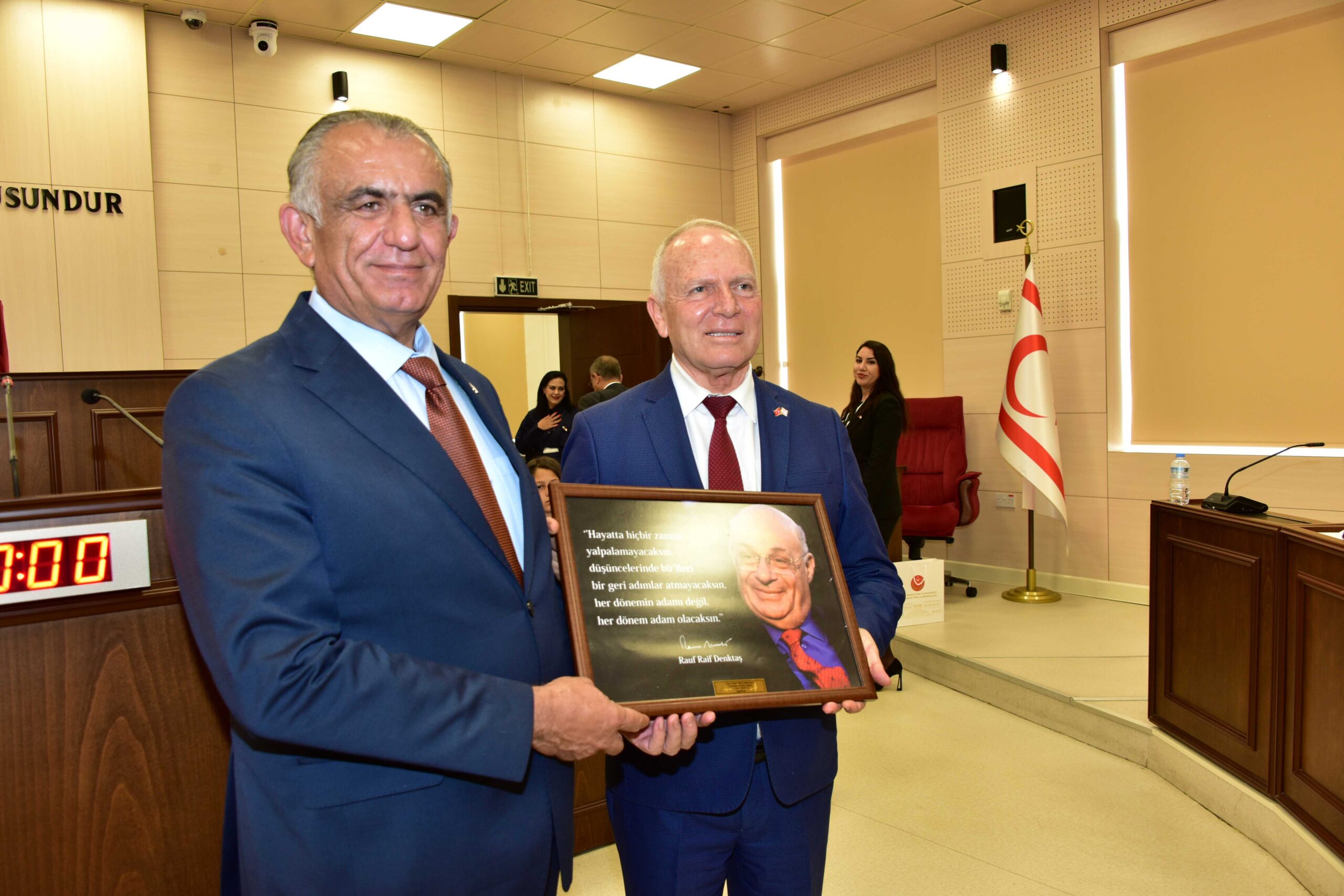 Genel Kurul toplantısının bitmesiyle Meclis Başkanı Zorlu Töre, Milli Eğitim Bakanı Nazım Çavuşoğlu’na Kurucu Cumhurbaşkanı Rauf Denktaş’ın çerçeveli fotoğrafını hediye etti.