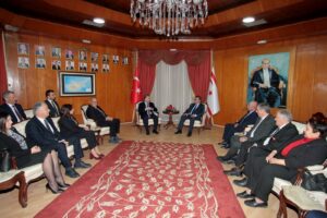 RTÜK Başkanı Ebubekir Şahin ise kabulde yaptığı konuşmada “RTÜK heyeti olarak her yeni seçimin ardından tıpkı Cumhurbaşkanımız Recep Tayyip Erdoğan ve diğer idarecilerimiz gibi bizler de göreve geldiğimizde ilk yurt dışı seyahatimizi Kuzey Kıbrıs Türk Cumhuriyeti’ne gerçekleştiriyoruz. Yayın Yüksek Kurulu ve üyeleri ile birlikte ilk günden itibaren çok güzel bir uyum ile işbirliklerimiz devam etmektedir. Hem uluslararası mecralarda hem de Türkiye Cumhuriyeti’nde yapılan uluslararası tüm toplantılarda beraberiz. Bunun dışında da var olan ortak çalışmalarımızda mevcut birlikteliğimizi devam ettireceğiz” ifadelerini kullandı.
