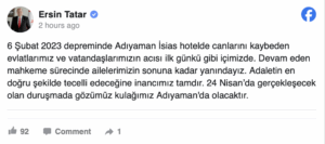 “6 Şubat 2023 depreminde Adıyaman İsias hotelde canlarını kaybeden evlatlarımız ve vatandaşlarımızın acısı ilk günkü gibi içimizde. Devam eden mahkeme sürecinde ailelerimizin sonuna kadar yanındayız. Adaletin en doğru şekilde tecelli edeceğine inancımız tamdır. 24 Nisan’da gerçekleşecek olan duruşmada gözümüz kulağımız Adıyaman’da olacaktır.”
