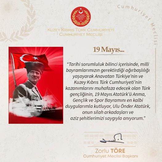 Tarihi sorumluluk bilinci içerisinde, milli bayramlarımızın gerektirdiği ağırbaşlılığı yaşayarak Anavatan Türkiye’nin ve Kuzey Kıbrıs Türk Cumhuriyeti’nin kazanımlarını muhafaza edecek olan Türk gençliğinin, 19 Mayıs Atatürk’ü Anma, Gençlik ve Spor Bayramını en kalbi duygularımla kutluyor, Ulu Önder Atatürk, onun silah arkadaşları ve aziz şehitlerimizi saygıyla anıyorum.”