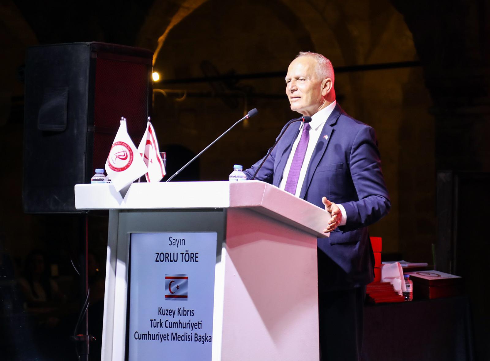 Töre burada yaptığı konuşmada üniversiteye adı verilen Kurucu Cumhurbaşkanı Rauf Raif Denktaş’ın hayatının ve düşüncelerinin bir üniversite olduğunu ifade ederek Denktaş’ın hayatında hiç yalpalamadığını özellikle milli meselelerde “Her dönemin adamı değil her dönem adam olunuz” nasihatinin siyaset için çok önemli olduğunu söyledi.